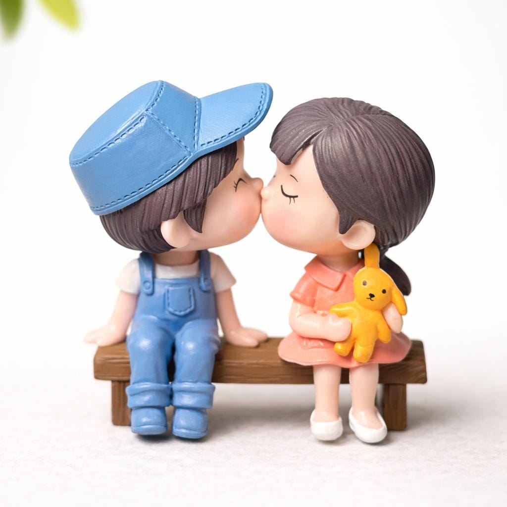 This kissing couple miniature is absolutely adorable and full of sweet charm! Featuring a boy and girl sharing a tender moment on a bench, this piece adds a romantic and whimsical touch to any setting.